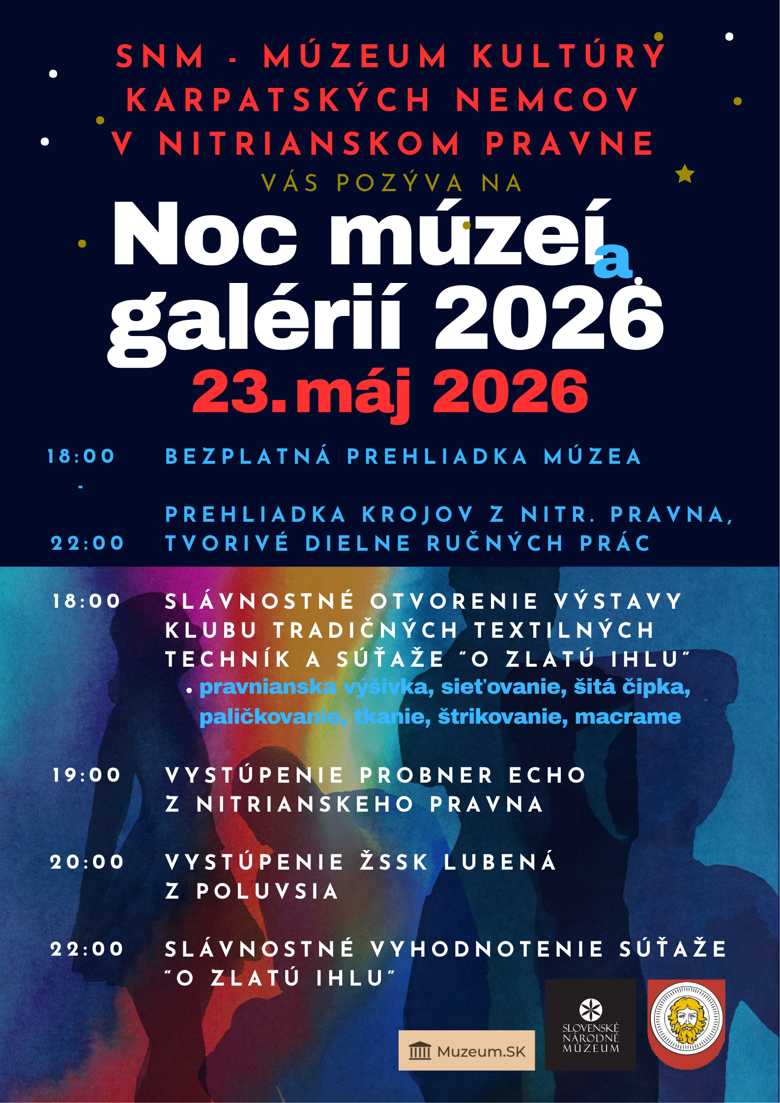 18:00 - 22:00 Bezplatná komentovaná prehliadka múzea, prehliadka sviatočných krojov z Nitrianskeho Pravna a okolia, tvorivé dielne ručných prác s lektorkami Klubu tradičných textilných techník